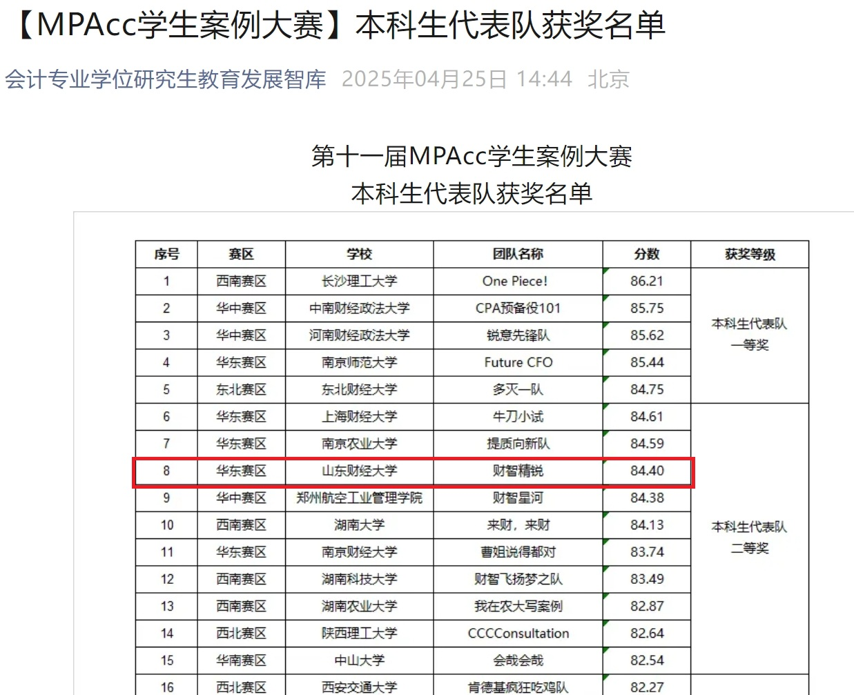 近日,2025年(第十一届)MPAcc学生案例大赛本科生组拉下帷幕。我院本科生代表队——财智精锐队(指导教师:朱磊、王春燕、丁鸿雁;参赛学生:赵晨萌、颜旭、付紫帆、陈晓卓),最终在全国307个本科生报名团队中脱颖而出,取得华东赛区第四、全国赛区第八的好成绩,获得本科生代表队全国二等奖。这是自该赛事举办以来我校本科生首次获奖,实现突破。