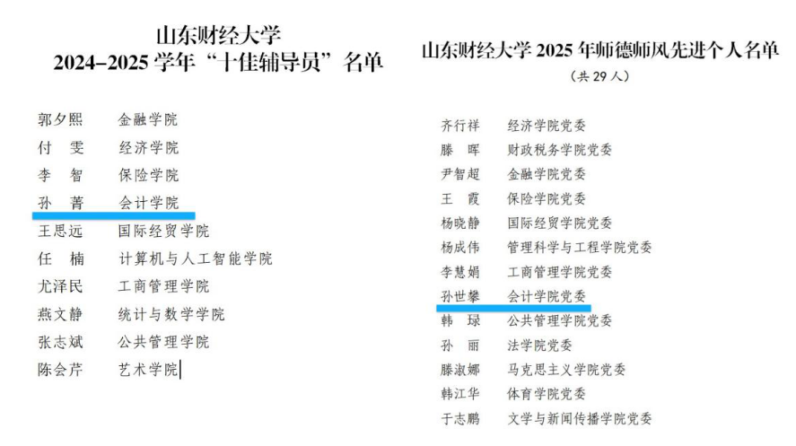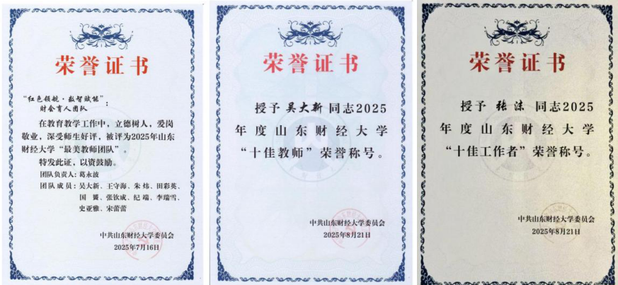 由会计学院院长葛永波担任负责人的“红色领航·数智赋能”财会育人团队,成功入选山东财经大学2025年“最美教师(团队)”,吴大新获评2025年度“十佳教师”,张沫获评2025年度“十佳工作者”,孙菁获评2025年度“十佳辅导员”,孙世攀获评“师德师风先进个人”。