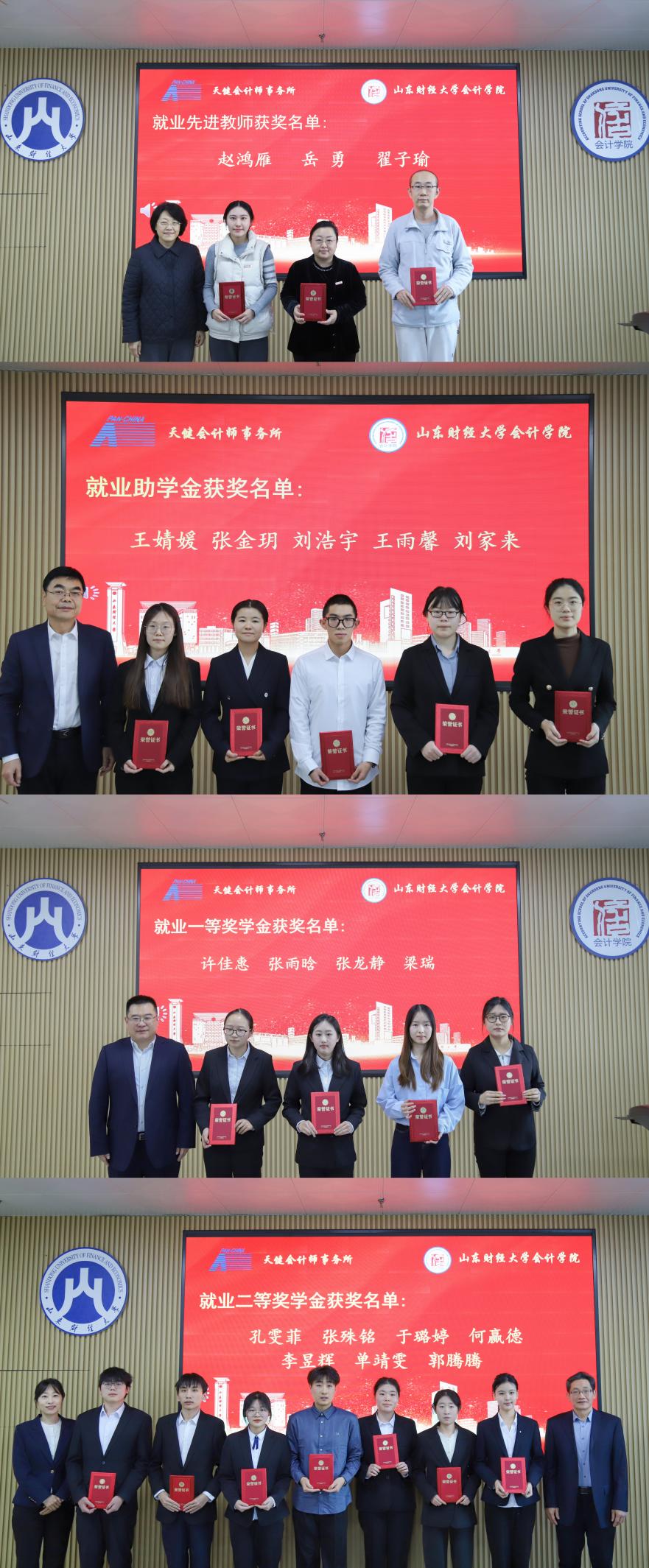 12月2日,我院2025年天健奖学金颁奖仪式在燕山校区举行。天健会计师事务所副总裁、山东分所总经理刘加宝,合伙人、山东分所总经理助理史钢伟,山东分所人力资源部经理宋小燕莅临现场,我校副校长张红霞,会计学院党委书记任海伦、院长葛永波,教师代表及获奖学生代表共同出席。仪式由学院党委副书记张贞梅主持。
