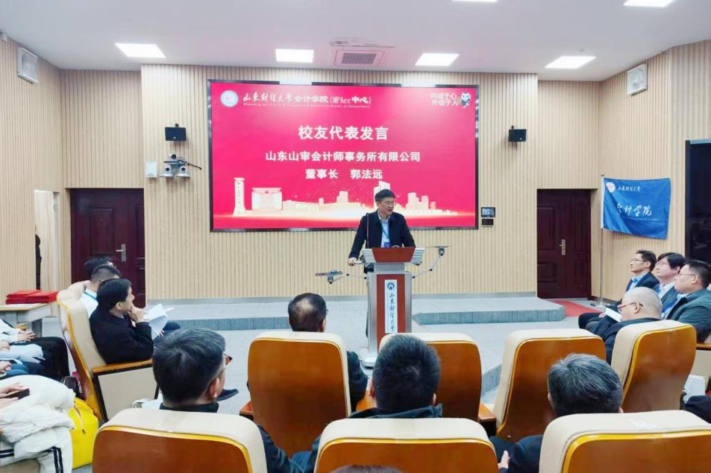 山东山审会计师事务所有限公司董事长郭法远作为校友代表发言。他深情回顾了自己在母校求学的经历,他表示,正是学校深厚的办学底蕴与创新的教学模式,为其奠定了扎实的专业根基与开阔的行业视野,使其逐步成长为今日勇于探索、追求卓越的业界实践者与开拓者。他深切感念母校的培育之恩,郑重表达了将继续秉持山财精神,为学校、学院的高质量发展贡献智慧与力量的坚定决心。
