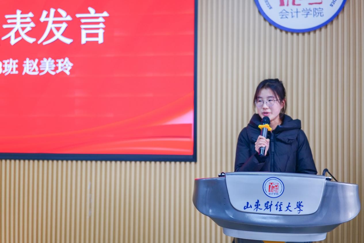 获奖学生代表赵美玲在发言中向学校与山东大地公益慈善基金会致以诚挚的谢意。她分享了自己的学习与生活经历,坦言奖助学金不仅有效缓解了家庭的经济压力,更让她真切感受到社会各界的关怀与扶持。这份温暖的力量将会激励着她在今后的求学路上奋发进取,以优异的成绩回馈社会,让这份爱心接力传递。