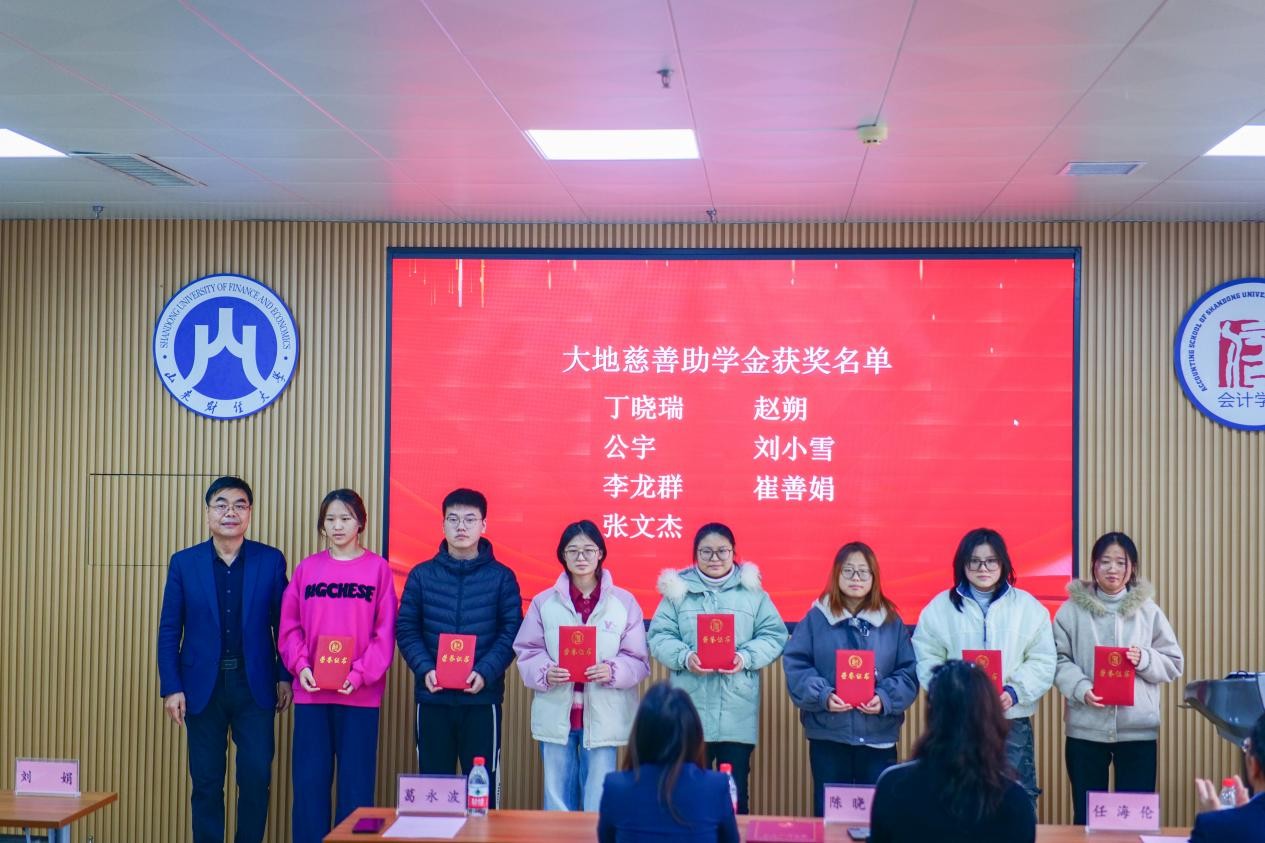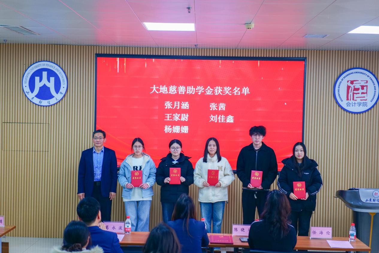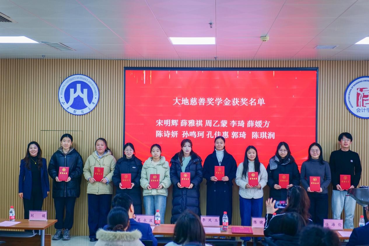 2025年12月19日,山东大地慈善奖助学金颁奖仪式在山东财经大学燕山校区举行。北京大地泰华会计师事务所(特殊普通合伙)轮值首席合伙人李凤玉、人力资源总监陈晓培、会计学院党委书记任海伦、院长葛永波、学生工作部副部长刘娟出席仪式。仪式由会计学院党委副书记张贞梅主持。