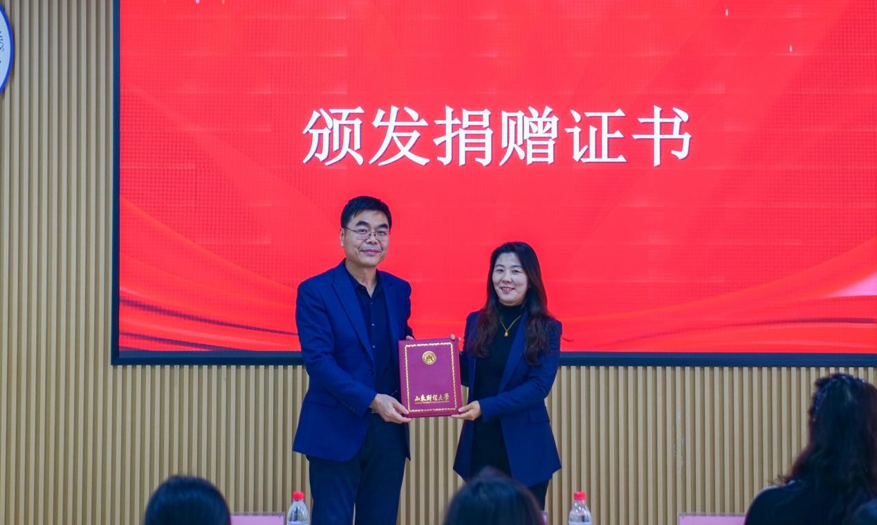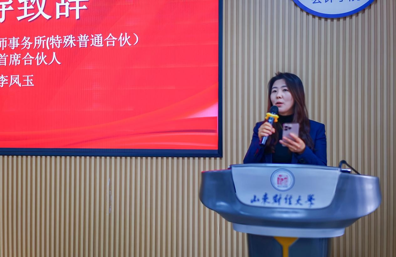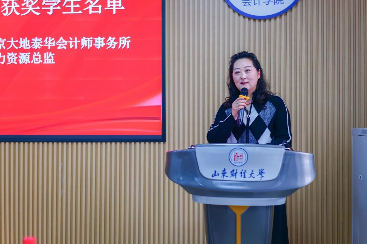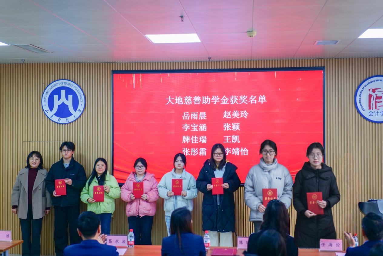 2025年12月19日,山东大地慈善奖助学金颁奖仪式在山东财经大学燕山校区举行。北京大地泰华会计师事务所(特殊普通合伙)轮值首席合伙人李凤玉、人力资源总监陈晓培、会计学院党委书记任海伦、院长葛永波、学生工作部副部长刘娟出席仪式。仪式由会计学院党委副书记张贞梅主持。