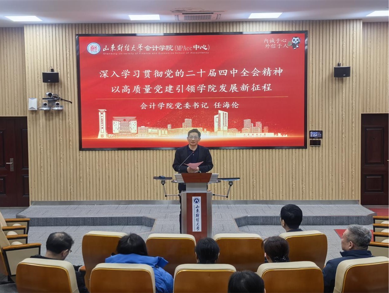近日,会计学院党委书记任海伦以《深入学习贯彻党的二十届四中全会精神——以高质量党建引领学院发展新征程》为题,面向学院全体教师作党的二十届四中全会精神专题宣讲报告。现场气氛庄重热烈,教师们认真聆听,共同感悟全会精神的思想伟力与实践要求。