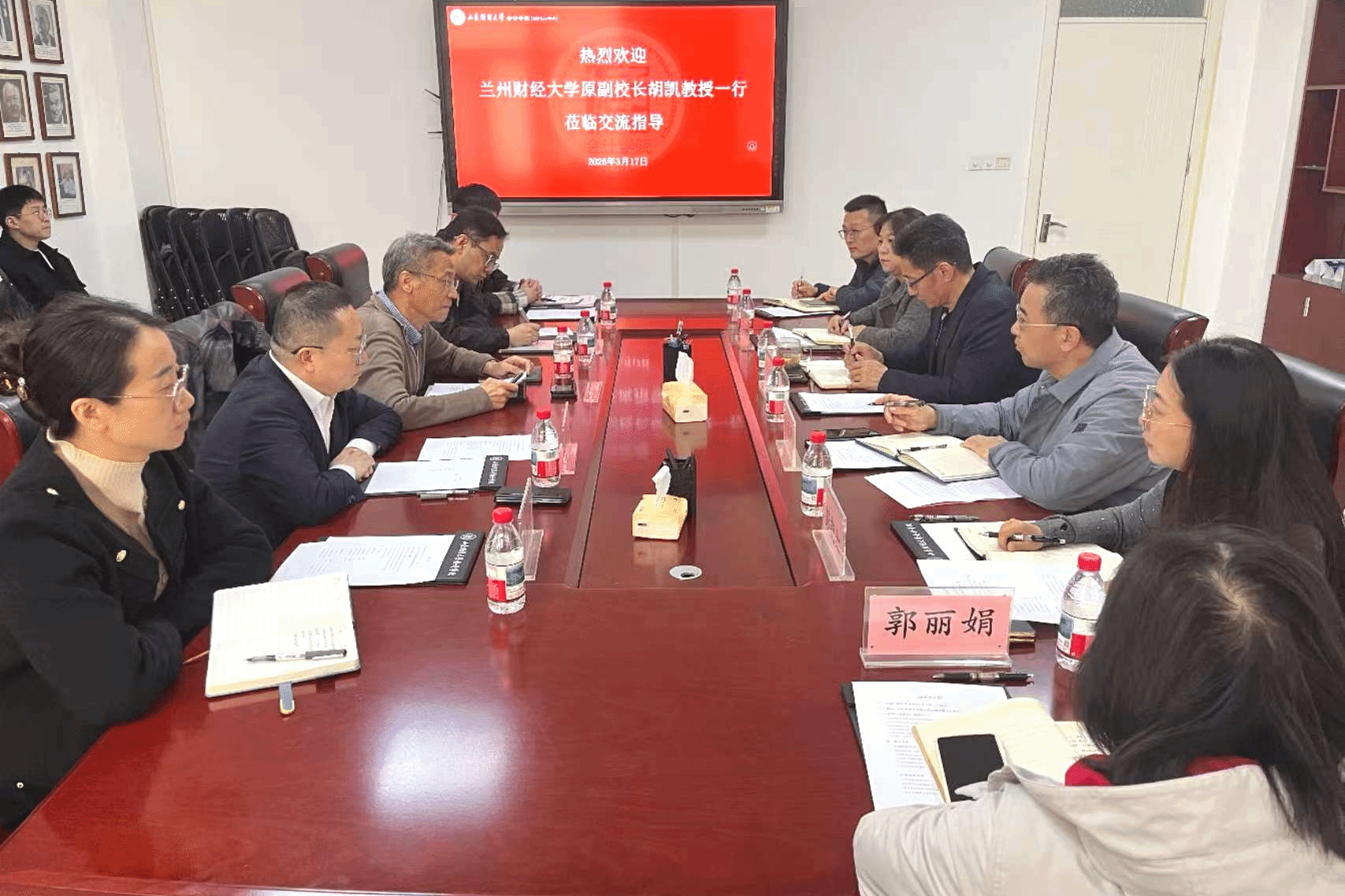 为深化校际合作、拓宽高层次人才引进渠道,精准对接博士研究生就业需求,2026年3月17日下午,兰州财经大学原党委常委、副校长胡凯率工商管理学院院长陈刚、副院长李强等一行,莅临山东财经大学,在燕山校区逸夫楼309会议室召开人才引进专场座谈会。本次座谈会由会计学院党委书记任海伦主持,两校相关学院负责人、辅导员及博士研究生代表参会。