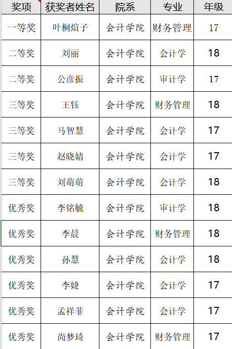 山东财经大学会计学院第四届会计知识竞赛在6月6日-6月13日举行,此次竞赛全部采用线上模式。比赛共有215人参赛,共有一等奖一名、二等奖两名、三等奖四名、优秀奖六名,共计十三支队伍获奖,获奖名单如下(每队仅仅列一名队员)。