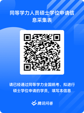 通过2023年同等学力全国统考、拟进行硕士学位申请的学员,请于2023年9月30日前扫下面二维码,根据二维码中的要求填报姓名、联系方式、申请硕士学位外国语水平和学科综合水平全国统一考试成绩等相关信息进行硕士学位申请报名。