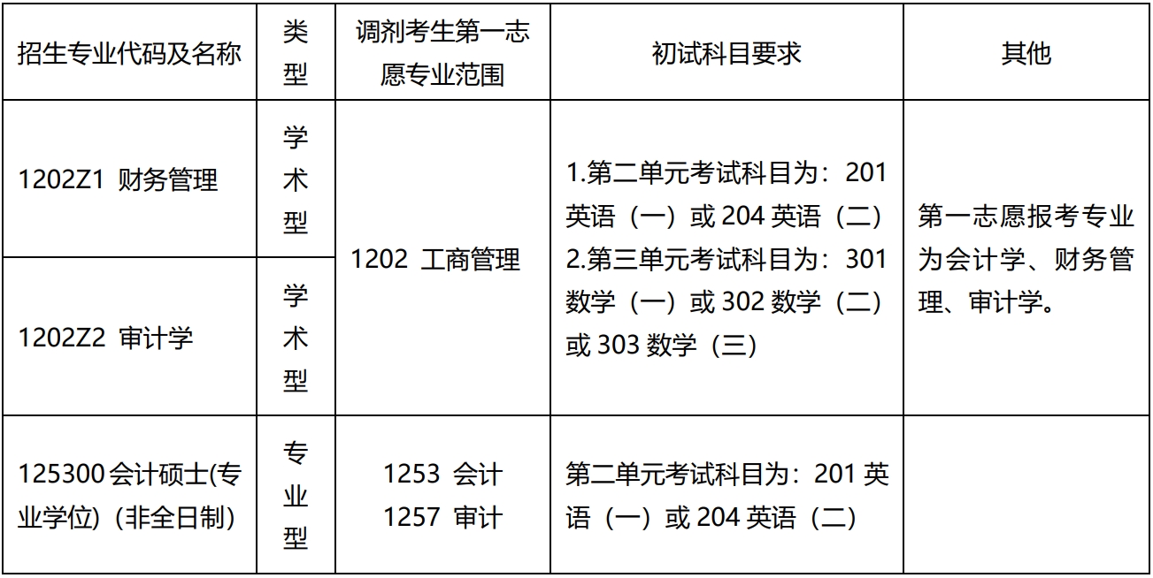会计学院2025年硕士研究生招生调剂考生第一志愿专业范围等学术要求一览表