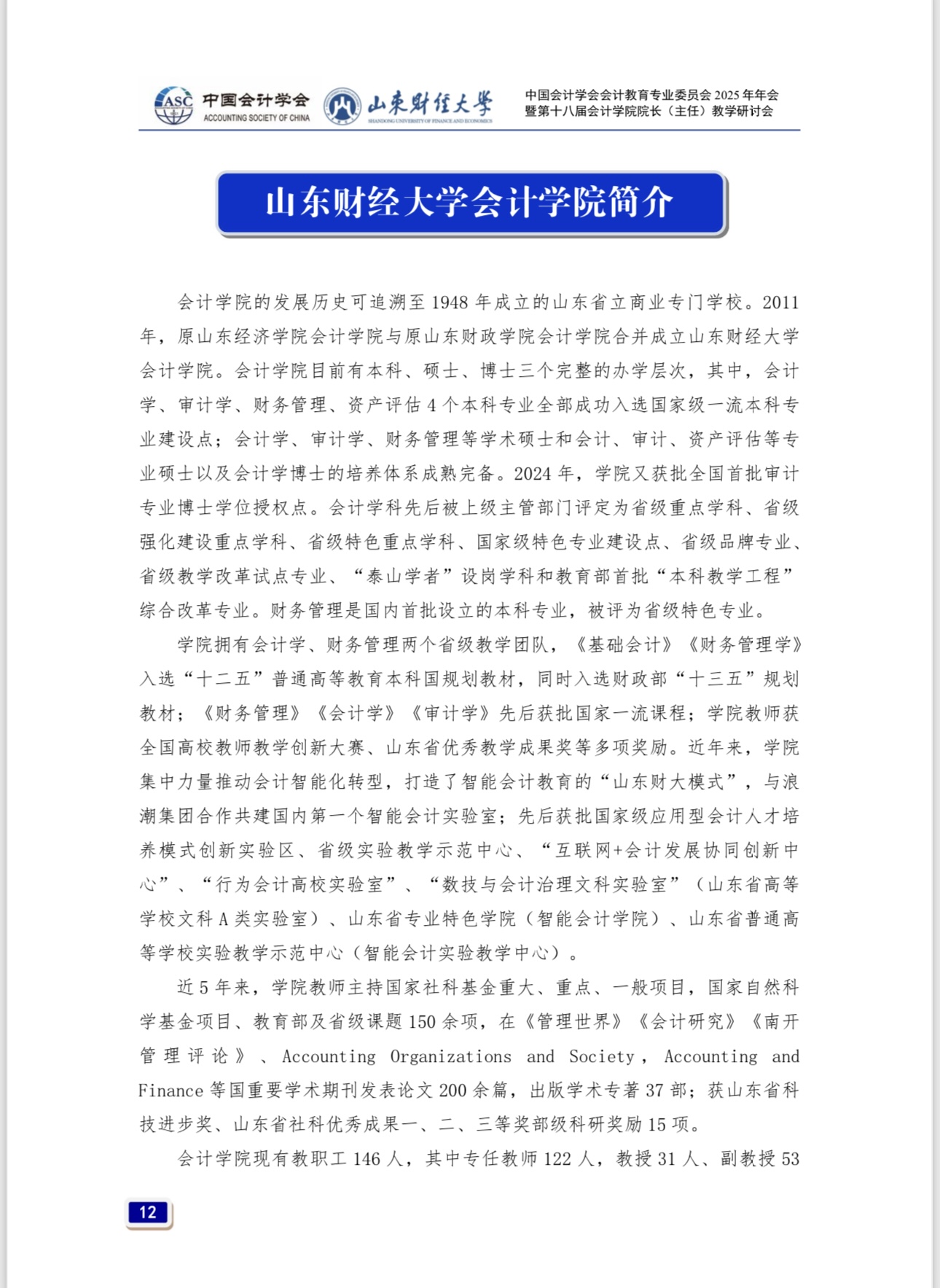 中共中央、国务院印发的《教育强国建设规划纲要(2024—2035 年)》,是首个以教育强国为主题、以全面服务中国式现代化建设为重要任务的国家行动计划,是全面推进教育科技人才一体统筹发展、提升国家创新体系整体效能的顶层制度安排,对落实党的二十大重大部署,更好发挥教育强国建设在全面推进强国建设、民族复兴伟业中的先导任务、坚实基础、战略支撑作用,具有重大而深远的意义。AI时代,传统会计教育模式面临巨大挑战。深化会计教育综合改革、建设高素质会计教师队伍、完善会计拔尖创新人才发现和培养机制、塑造立德树人新格局,是会计教育界贯彻落实教育强国战略的重要举措。为此,由中国会计学会会计教育专业委员会主办、山东财经大学会计学院承办的“中国会计学会会计教育专业委员会2025年年会暨第十八届会计学院院长(主任)教学研讨会”,于2025年9月26日至28日在山东省济南市举行,以下是会议具体安排。