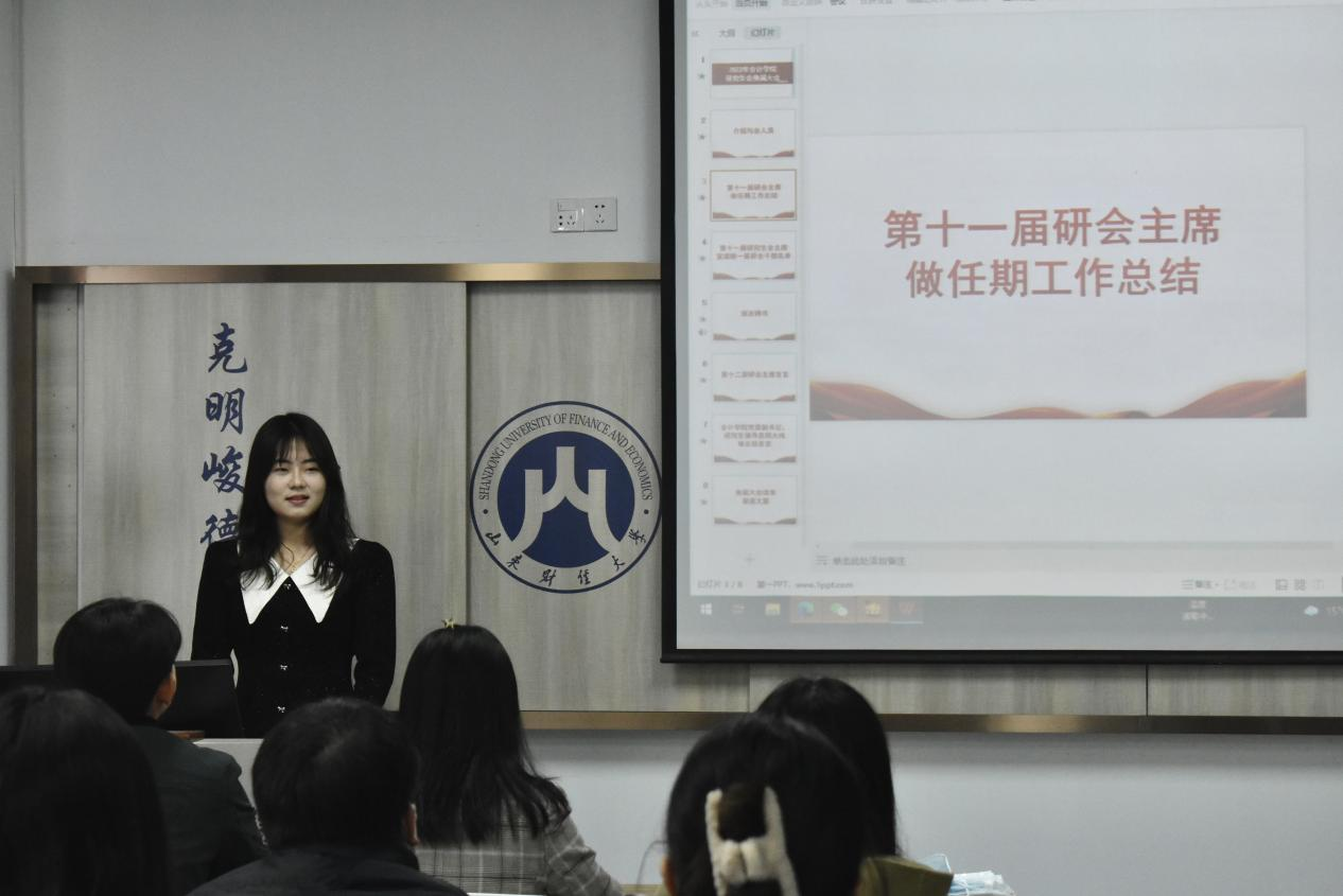 会议伊始,由会计学院第十一届研究生会主席高薇进行任期工作总结。在总结中,高薇对过去一年各部门的工作成果表示了肯定,对研究生会全体成员的努力表达了衷心的感谢。同时,针对第十二届研究生会全体成员,高薇提出了两点期许。第一,作为研究生会的成员,必须做到“尽职、尽责、尽心”,在其位谋其职,认真做好自己的本职工作;第二,研究生会内部是一个温暖的大家庭,各成员要团结一致,做一个有温度的人。
