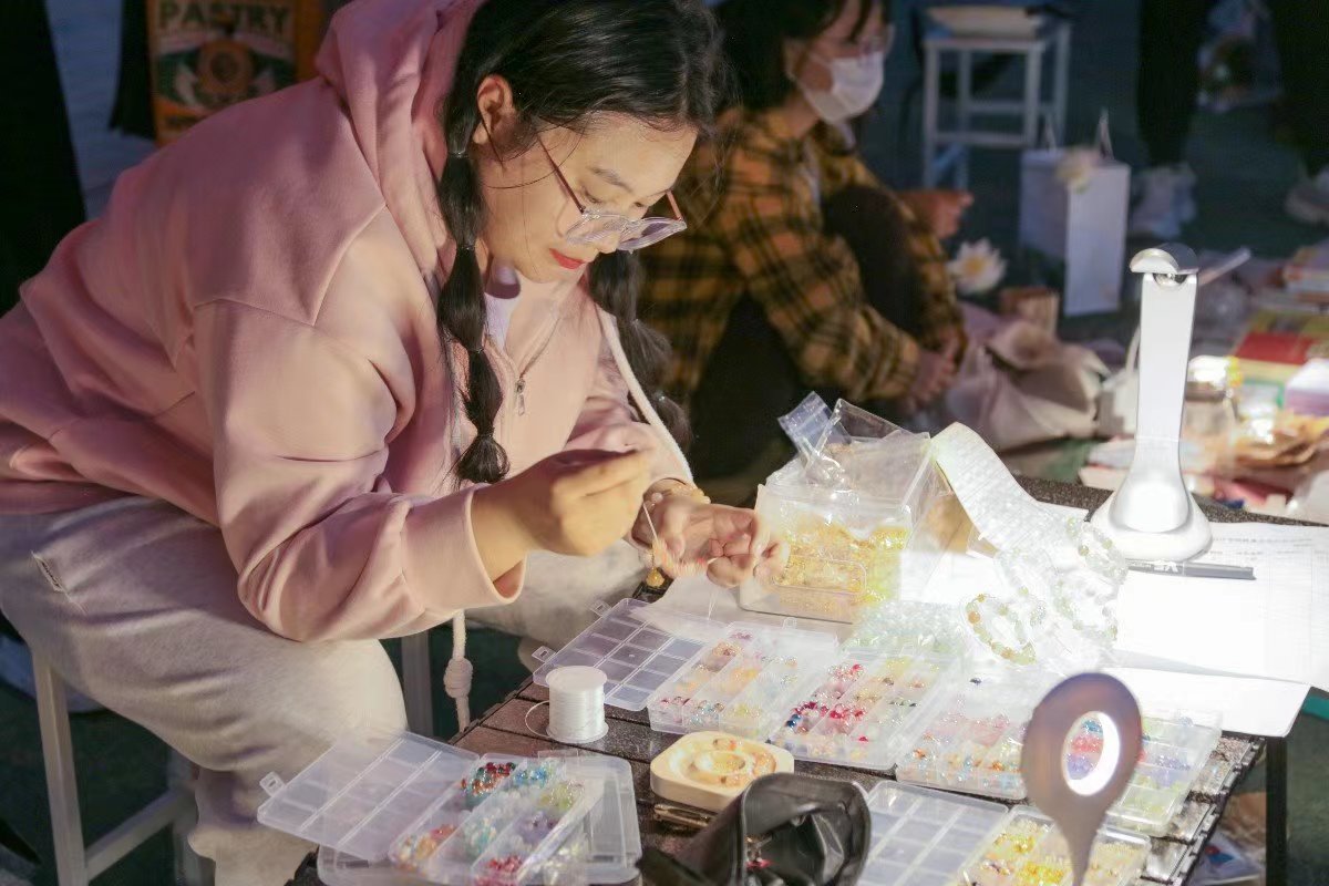 到了晚上,摊位纷纷点起小灯,深邃的黑夜中,灯光和同学们的热情点亮了跳蚤市场。