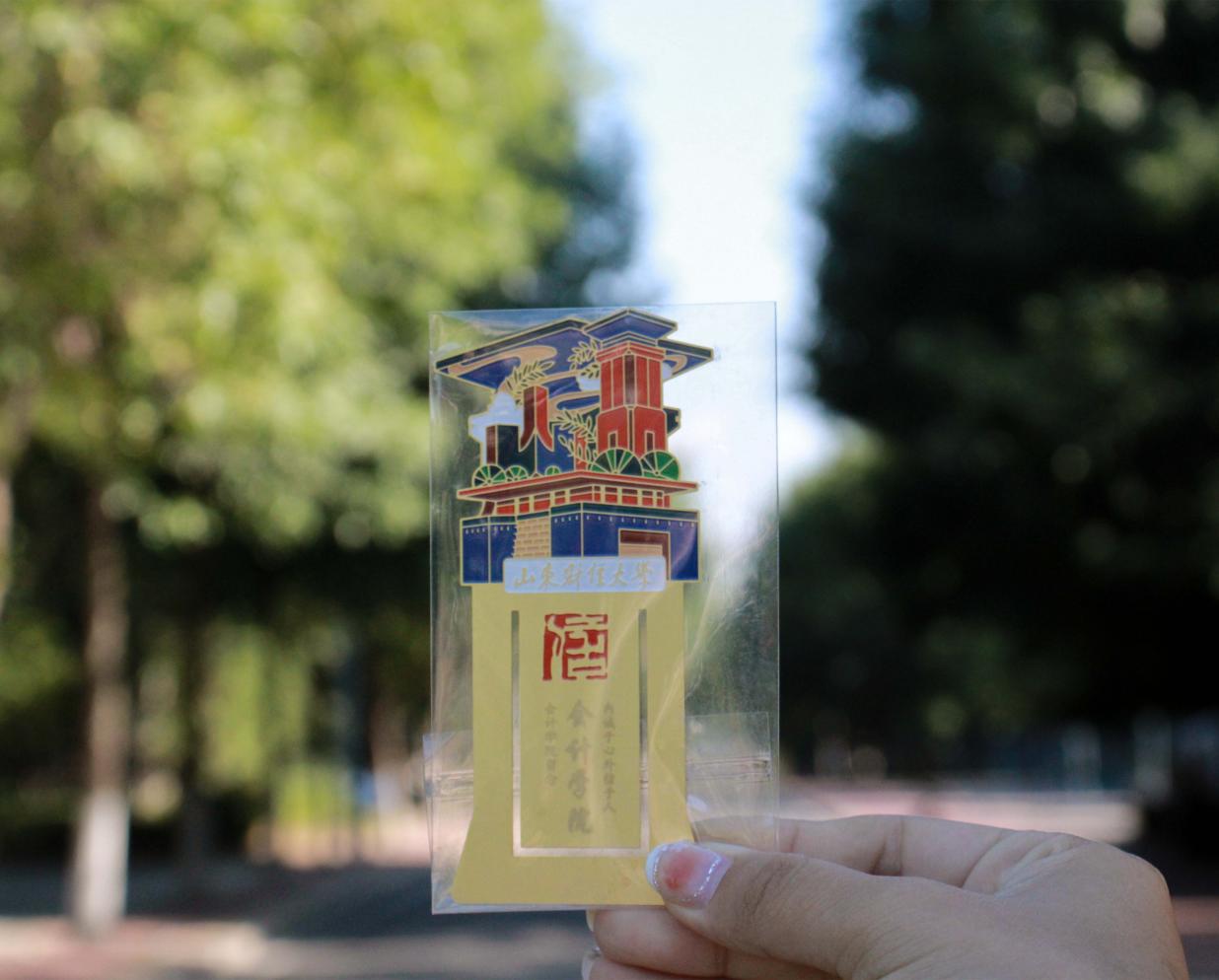 书签主要配色源于山东财经大学校徽和会计学院院徽,山东财经大学图书馆作为书签的主要元素,并在其中穿插了分别象征着友好、顽强向上、美好憧憬等的橄榄枝、松叶、白云等要素,代表着会院学子美好的品质。那校园的四季与光影,都被镌刻在学子们的心头,被浓缩在这枚小小的书签上,寄托着山东财经大学会计学院对毕业生们最真挚的祝福。