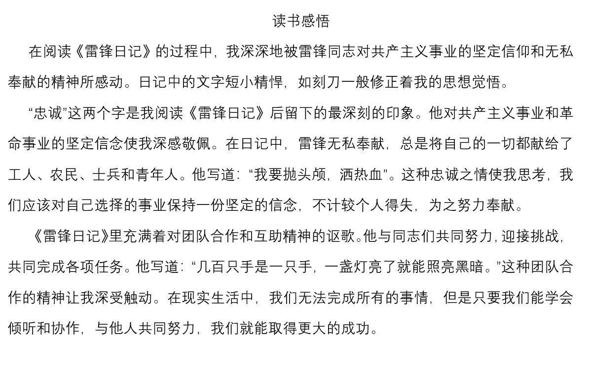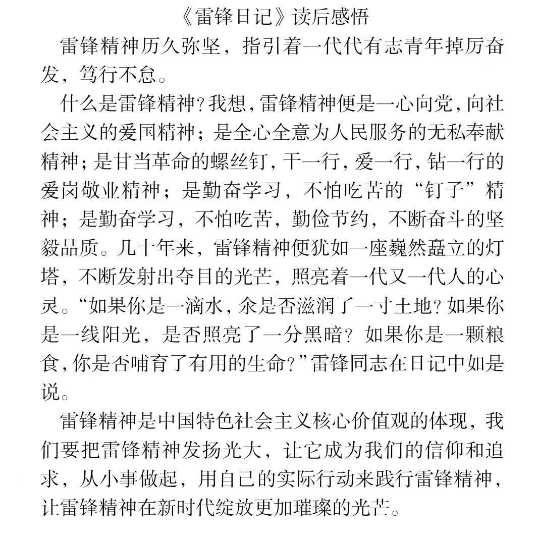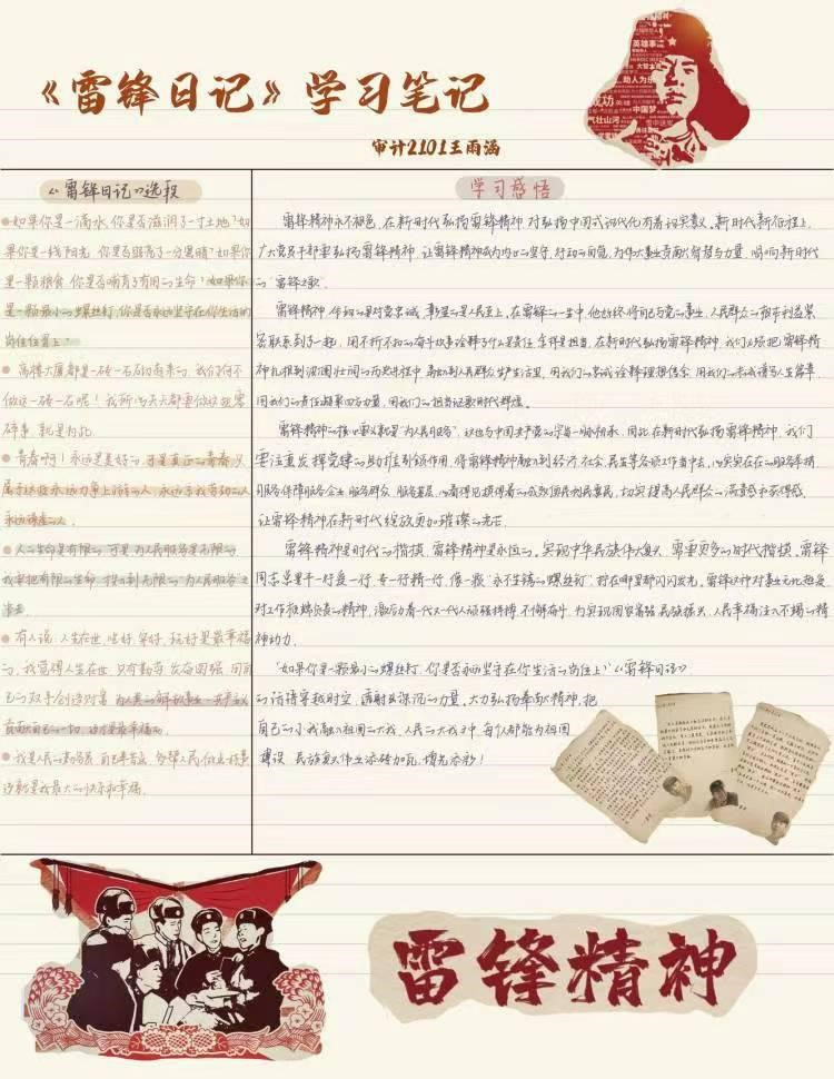 春风拂面,雷锋精神暖人心。六十年来,雷锋精神代代赓续传承,持续滋养着千千万万个我们,历久弥坚。为强化同学们对雷锋精神的认识,倡导无私奉献、乐于助人的社会风尚,会计学院特举办“心声共勉 向‘锋’而行”感悟撰写活动。在此次感悟撰写活动中,同学们积极参与,认真阅读《雷锋日记》、雷锋传记或观看相关纪录片,更直观、深入地感悟到雷锋同志乐于助人、甘愿为人民服务的伟大精神,用细腻的文字,精美的照片表达了对雷锋精神的赞美和敬佩,创作出许多内容充实,感情真挚的作品。经过认真评选,许多同学的作品被遴选为优秀作品。其中部分优秀作品如下: