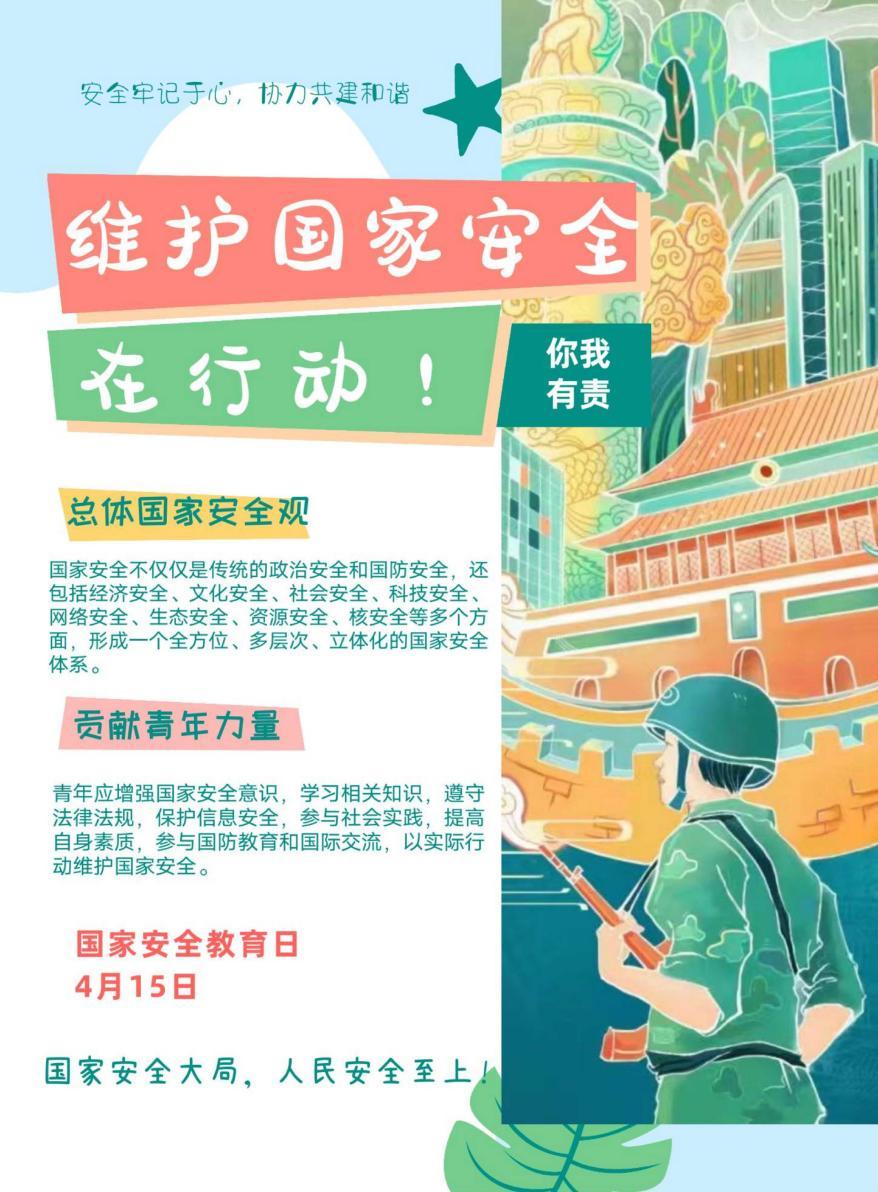 为深入学习贯彻总体国家安全观,增强同学们的国家安全意识,营造全员共筑大安全格局的浓厚氛围,在第九个“全民国家安全教育日”到来之际,我院特围绕“总体国家安全观 创新引领10周年”的活动主题,组织开展了“创意点亮国安,海报传递力量”之海报设计活动。