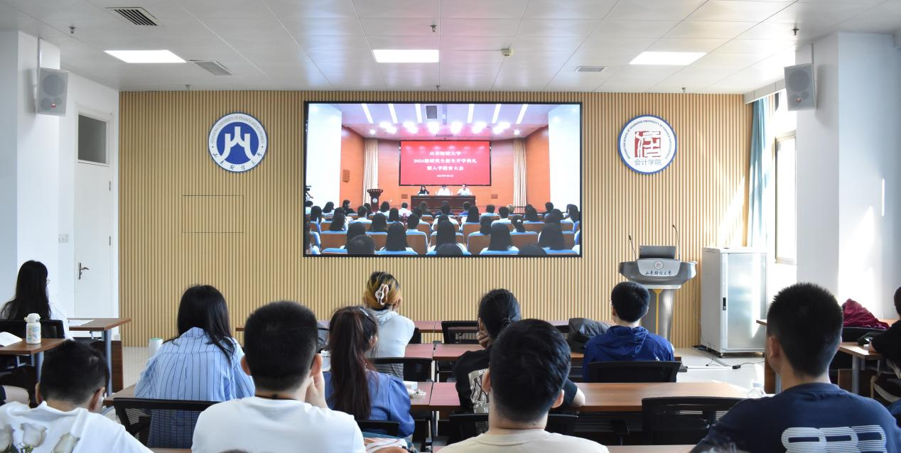 此外,2024级全体研究生一起观看了山东财经大学研究生新生开学典礼暨入学教育大会。校领导的讲话高屋建瓴、深入浅出,既有对学术前沿的敏锐洞察,又有对人生哲理的深刻领悟;教师代表的发言则充满温情与智慧,用亲身经历为新生们树立了榜样;而学长的分享则更加接地气、有温度,他们用自己的成长故事激励着每一位新生勇敢追梦、不懈奋斗。