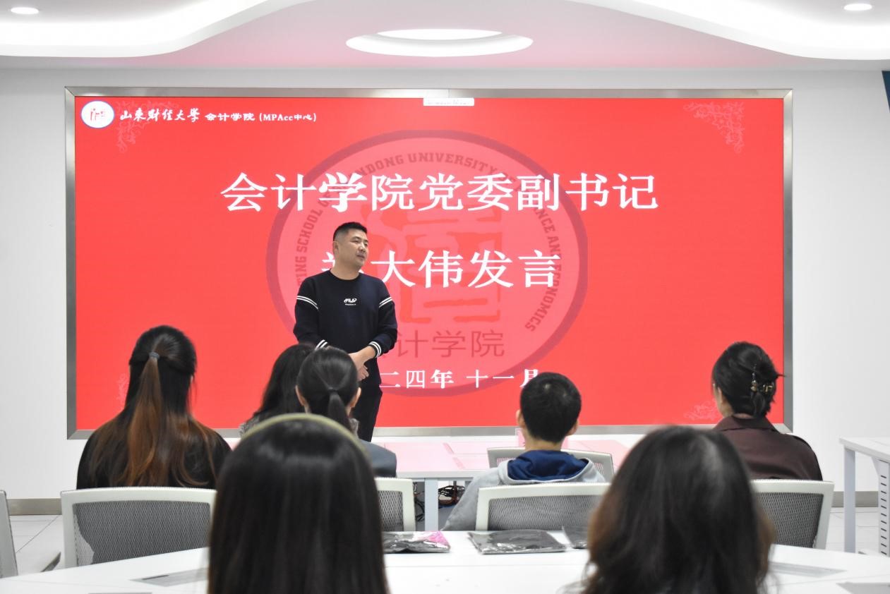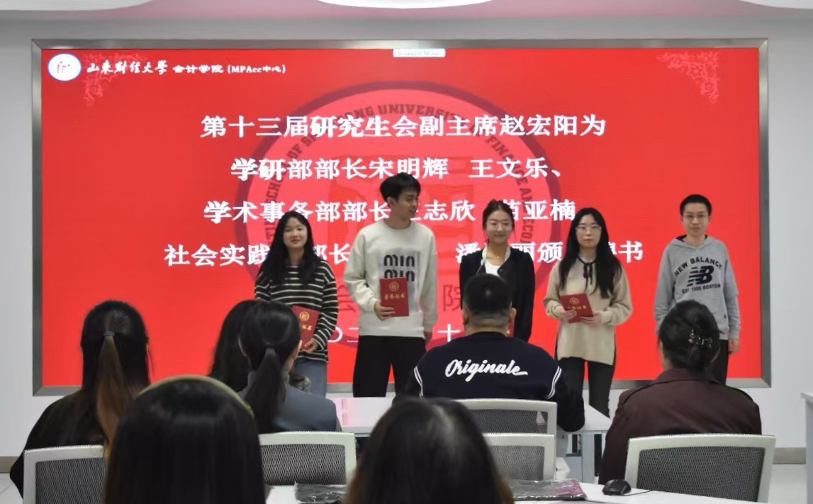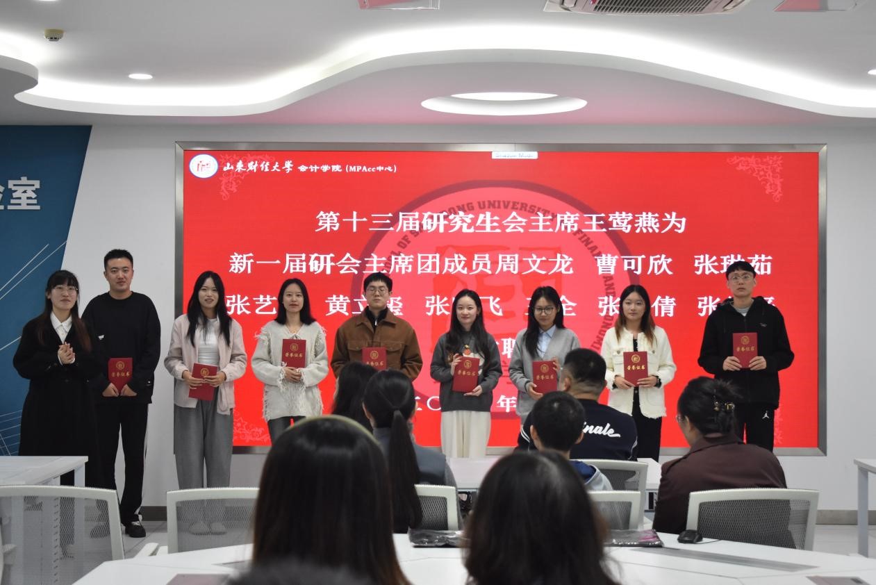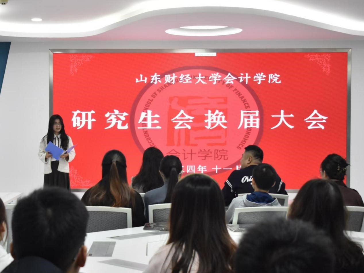 11月1日上午,山东财经大学会计学院第十四届研究生会换届大会在燕山校区逸夫楼320教室成功举行。会计学院党委副书记郑大伟、研究生辅导员史岩出席大会,第十三届研究生会主席团、第十四届研究生会主席团、部长以及干事代表参加。会议由2024级会计学硕班魏凤楠主持。