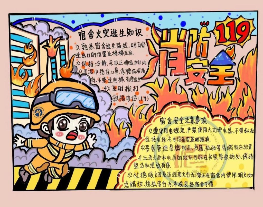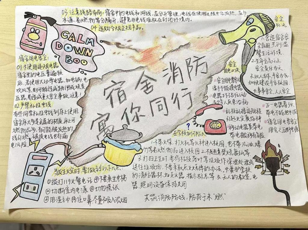 绘消防情,传安全声。本次活动中,同学们用画笔勾勒出以宿舍消防安全为主题的画报,积极地向同学们传递消防安全知识,分享自身见解。这不仅增强了同学们的安全意识,更增进了同学们对学校安全教育工作的认同感,帮助同学们树立正确的安全观念。