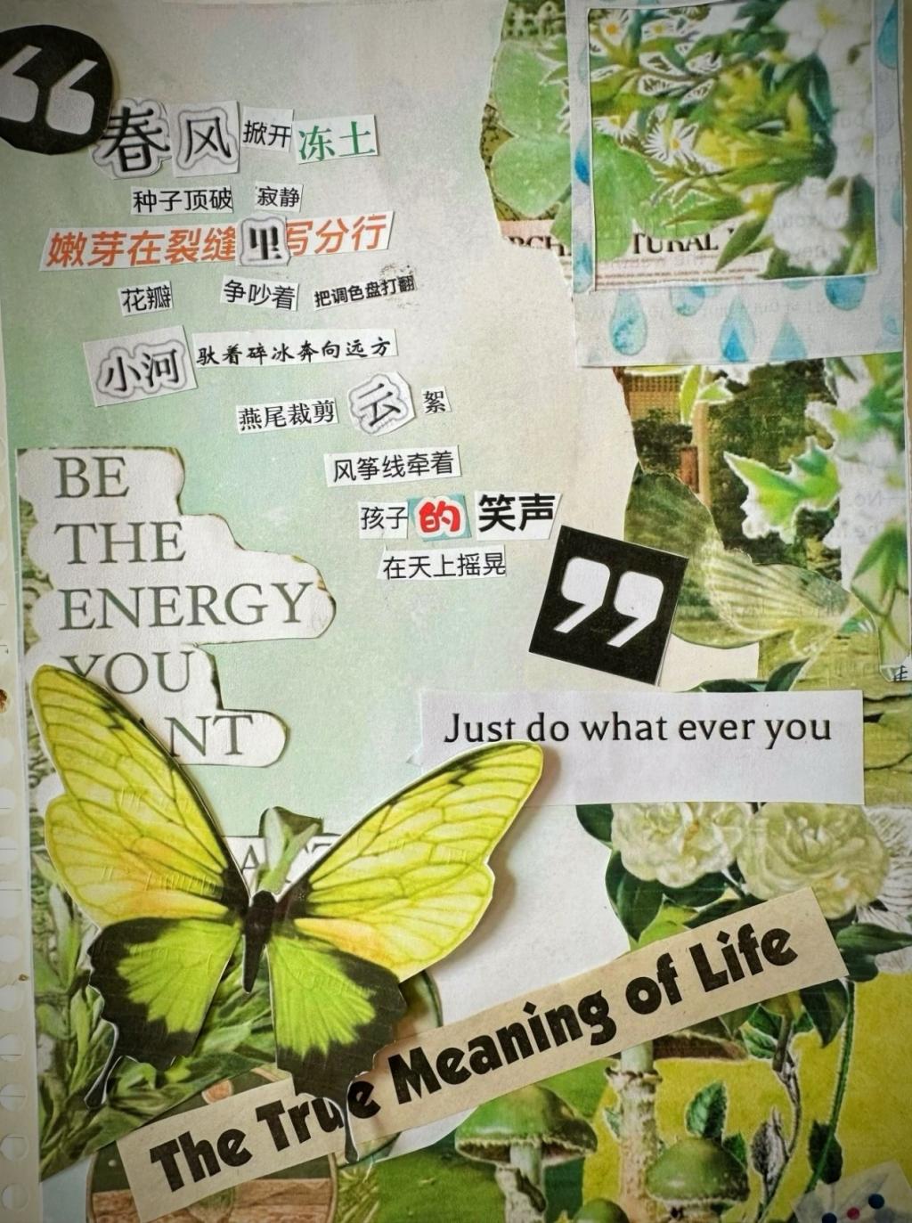 这幅拼贴诗作品旨在捕捉春天灵动且充满生机的瞬间。创作之初,我便被春天万物复苏的力量所触动。“春风掀开冻土”,春风作为春天的先声,它有着打破冬日禁锢的力量,宣告着新生命的登场。“种子顶破寂静”,种子象征着希望与新生,它们在黑暗中积蓄力量,打破冬日的死寂。“嫩芽在裂缝里写分行”,将嫩芽比作书写春天诗句的墨客,以独特的姿态描绘春景。花瓣“争吵着,把调色盘打翻”,用拟人手法展现春天色彩的绚烂,仿佛是花儿们在肆意挥洒色彩。“小河驮着碎冰奔向远方”,描绘出春冰消融、河水奔腾的画面,带着勇往直前的气势。“燕尾裁剪云絮”,燕子是春天的使者,它们灵动的身姿如剪刀般裁剪着云朵。“风筝线牵着孩子的笑声,在天上摇晃”,则展现了春天里人们欢快的生活场景,传递出春天的活力与美好。“Just do what ever you”与“The True Meaning of Life”融入其中,意在传达在这生机勃勃的春天里,应勇敢去做,探寻生命的真谛,为作品增添了哲思深度,将自然之春与生命感悟相融合。