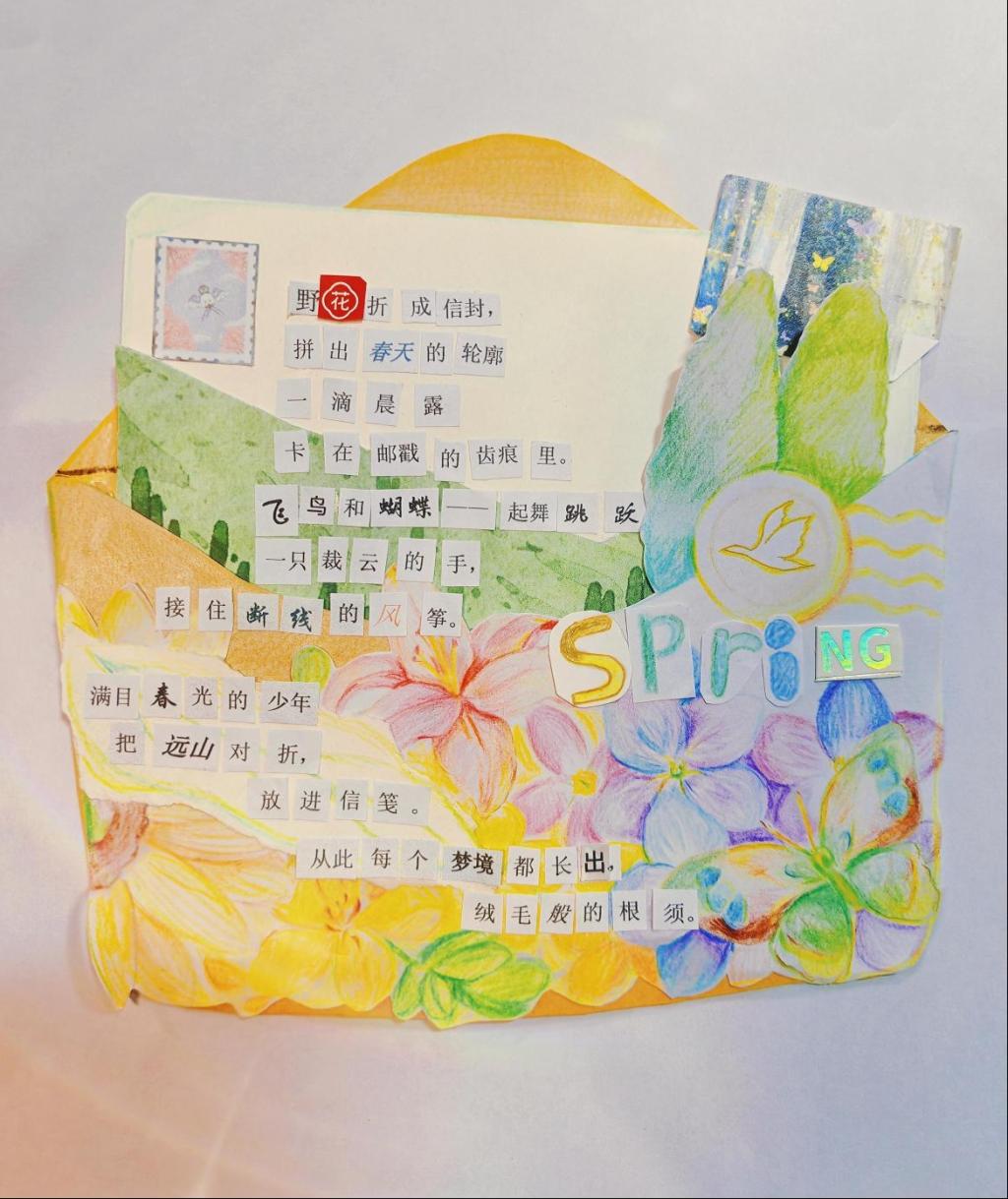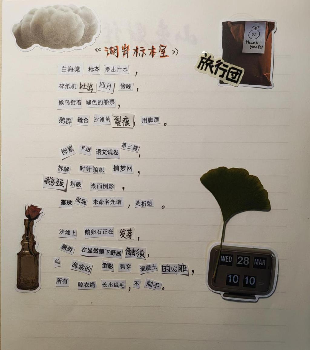 书香似缕,雅韵悠长。当色彩与文字在方寸之间相遇,会计学院的同学们以剪刀作笔,胶水为墨,将零碎的字句、斑斓的图案重新编织成独一无二的诗篇。每一份拼贴都是内心世界的热烈表达,每一次创作都是与自我、与生活的深情对话。拼贴诗的魅力,在于打破常规,重组想象,让我们在看似无序的素材中,找到属于自己的诗意秩序。愿这份创作的热情永不熄灭,未来的日子里,让我们继续用敏锐的目光收集生活碎片,用创意的双手拼出更精彩的人生图景。
