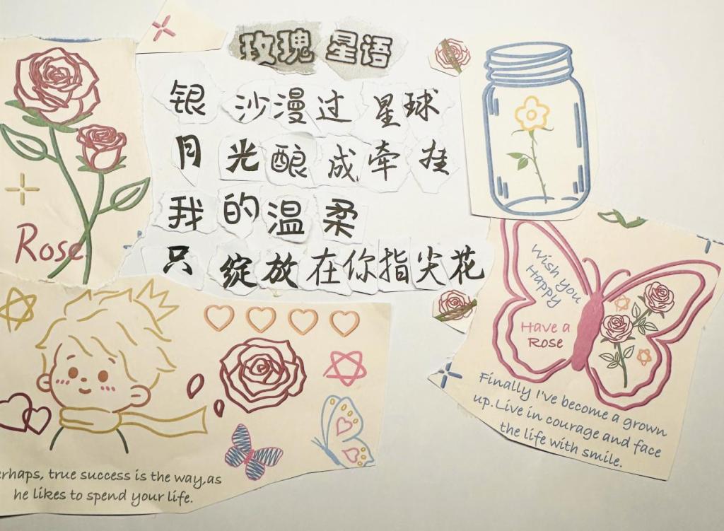 创作这首拼贴诗时,我以《小王子》中孤独漫游与纯粹爱意作为灵感来源。“银沙漫过星球”化用小王子在B612星球独自劳作的场景,将宇宙尘埃比作时间流逝的痕迹,暗示每个孤独星球都藏着等待被发现的温柔。“月光酿成牵挂”呼应小王子星际旅行时,每当仰望星空便涌起对玫瑰的思念,月光如同发酵的记忆,盛满跨越光年的深情。而“我的温柔,只绽放在你指尖花”,既延续玫瑰带刺却脆弱的特质,又融入新的理解——正如小王子明白玫瑰因彼此陪伴而无可替代,这里的“指尖花”强调温柔是双向互动的产物,唯有相互触碰,爱才能绽放出超越表象的绚烂。