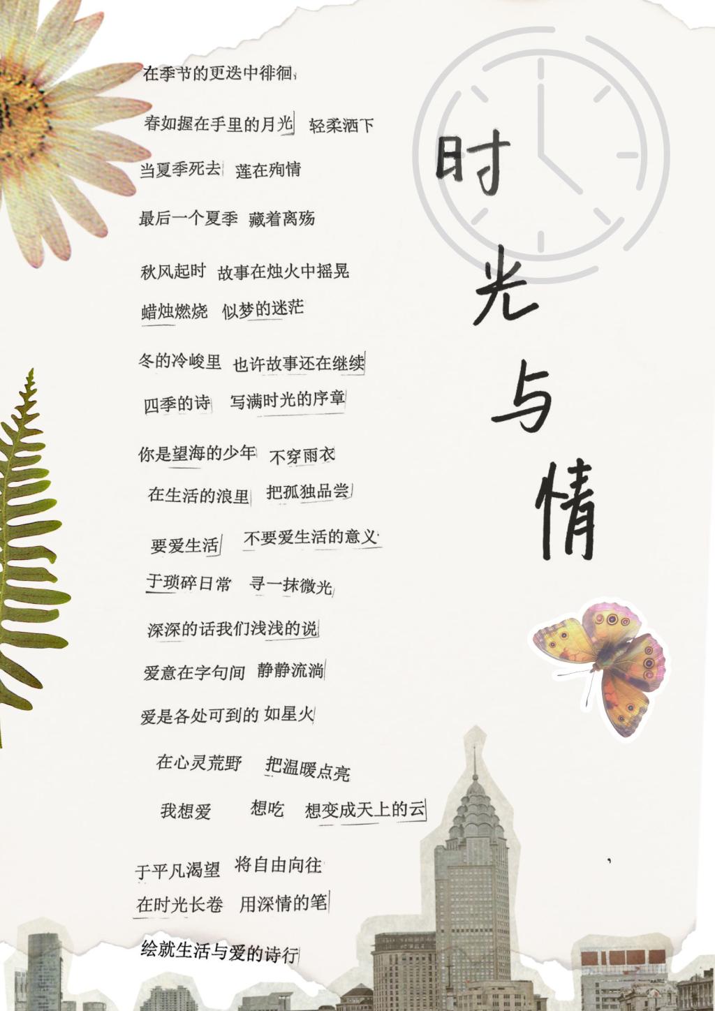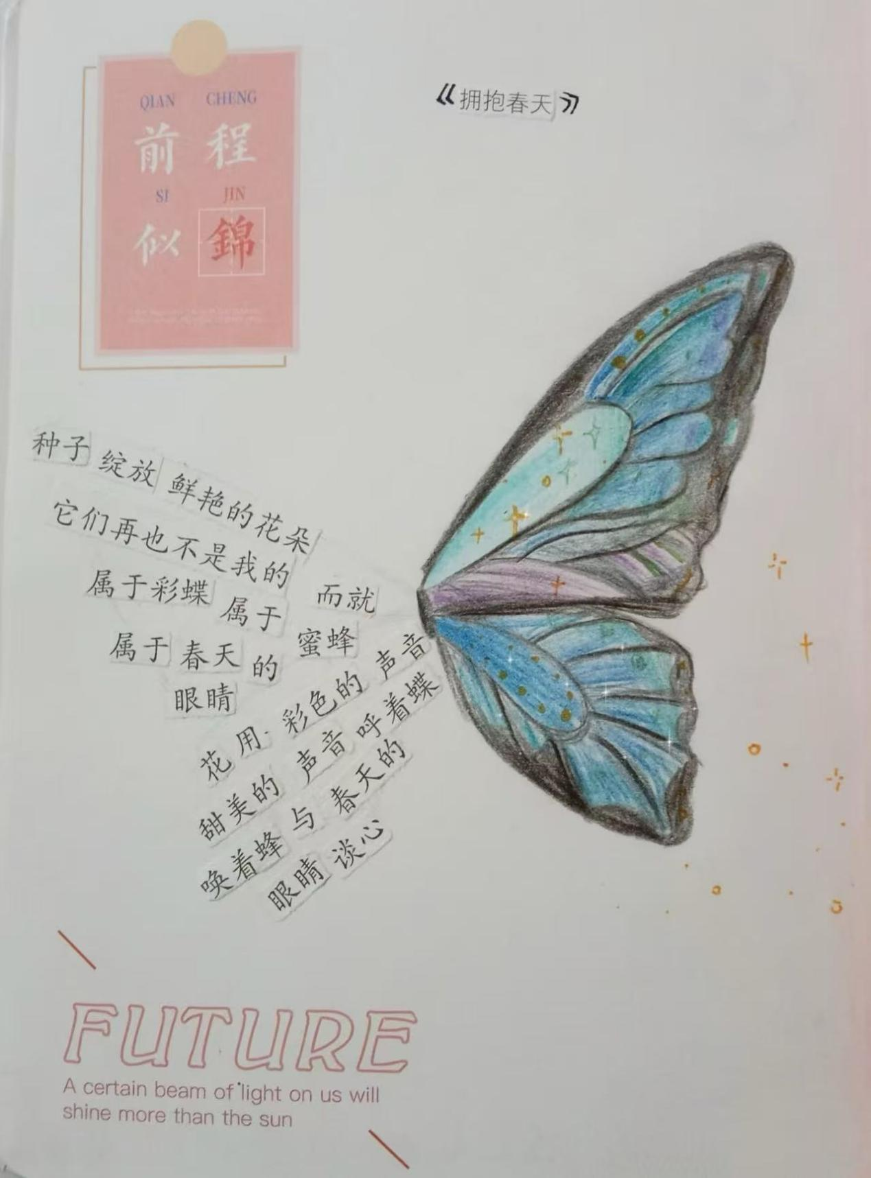 在“意剪生活画,诗写青春风”主题下,我希望通过拼贴诗展现青春独特魅力。青春充满梦想,如同夜空中绚烂烟火,所以我从书籍中选取关于梦想、奋斗的词句,代表青春积极向上的追求,它们像星辰照亮青春道路。时光信笺象征成长轨迹,希望与坚持的话语叠成纸飞机,寓意青春在探索中不断前行。青春难免迷茫挫折,但勇敢和信念能改写困境,体现青春不服输、不断成长的精神。每个元素都是青春写照,组合起来构成青春奋斗、充满希望与挑战的多彩画面,用文字拼贴出独属于青春的诗篇。