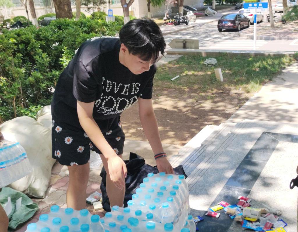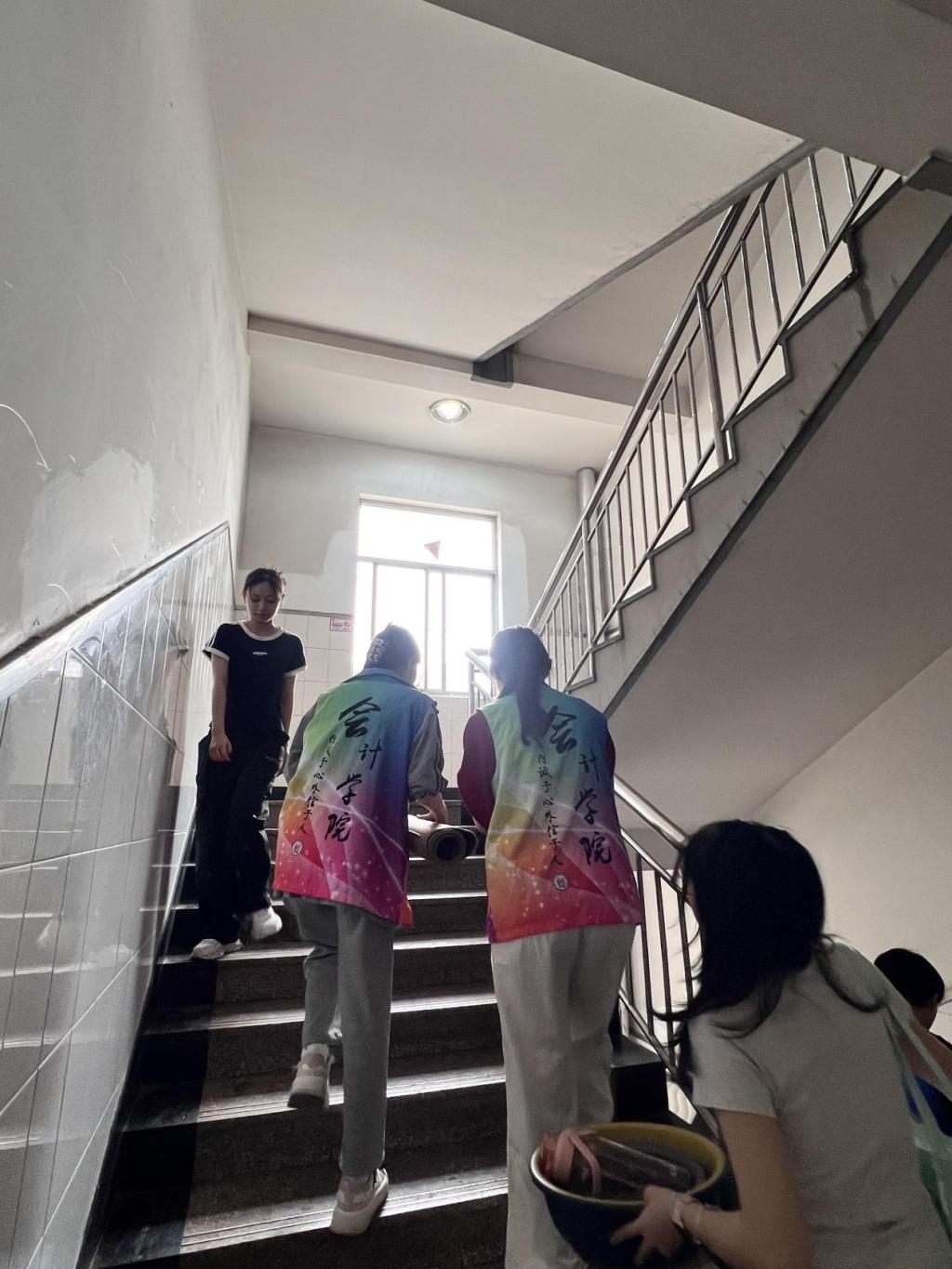 志愿者们分批上岗,提前集合后按楼层分工协作,接力搬运。尽管汗水浸透衣衫,他们仍坚持"点对点"送达指定宿舍。各点位均贴心配备了学院准备的矿泉水,志愿者们在维持着高效工作节奏的同时,也时刻关注着行李安全和同学们的需求。