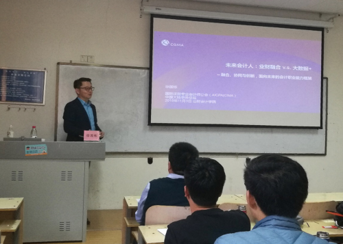 2018年11月3日下午,徐国栋应我院邀请,在燕山校区Y308教室作题为《融合、协同与创新,面向未来的财经职业能力框架》的专题报告会。会计学院副院长、MPACC中心主任朱德胜出席并主持了报告,会计学院部分老师以及非全日制硕士研究生参加了报告。徐国栋现任国际注册专业会计师协会(AICPAICIMA)中国大陆事务总监。