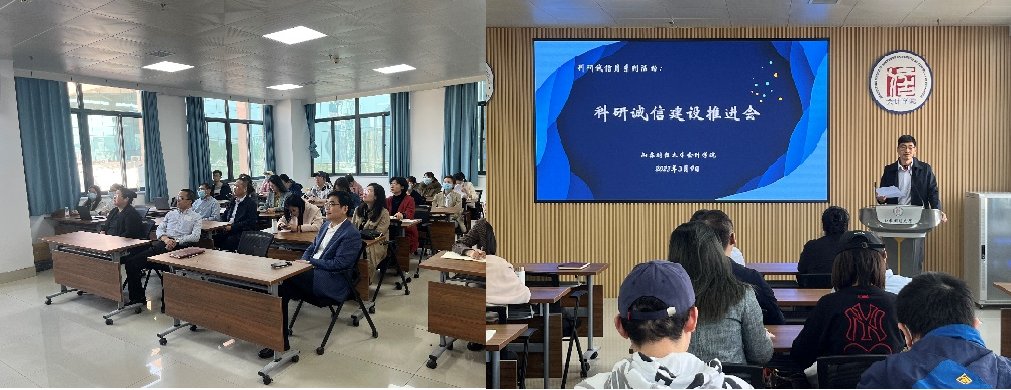 吴大新首先总结了上一阶段的科研诚信建设工作,再次传达了中共中央办公厅、国务院办公厅《关于进一步加强科研诚信建设的若干意见》、省教育厅《关于进一步加强高等学校科研诚信工作的意见》等重要文件精神,并强调,“信”是会计学院的底色,全院师生应争做科研诚信的排头兵,更应将“他律”转换为“自律”,将“诚信”二字内化为自己的信念,不断提升科研水平和道德水准。