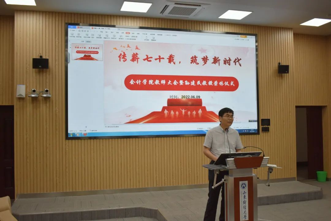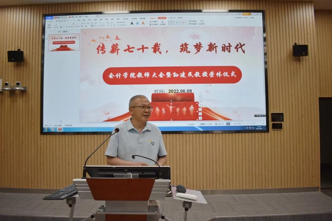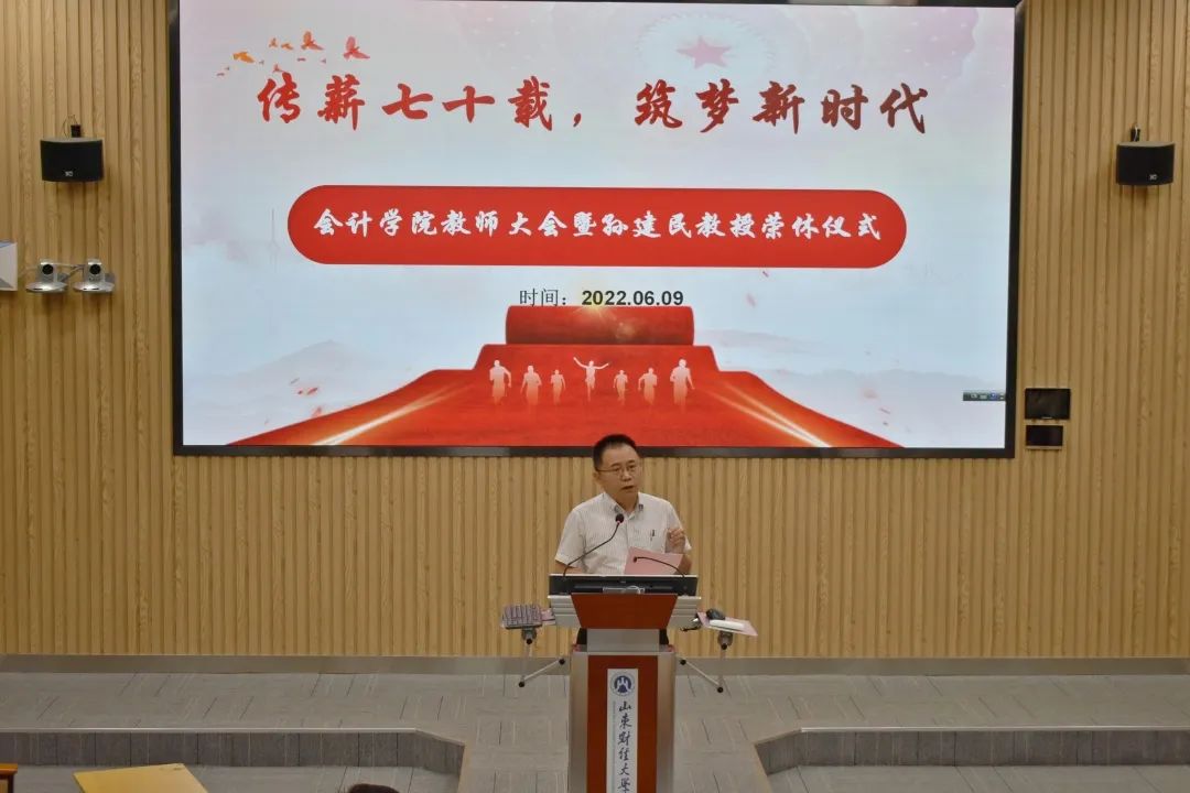 会计学院教师大会暨孙建民教授荣休仪式庄重而又温暖,规范又不失情怀,有激励、有期待、有别离。会计学院老前辈在风雨兼程的洗礼中,铸就了会院现在的发展。昨天,我们以你们为荣。明天,我们不忘初心,薪火传承。