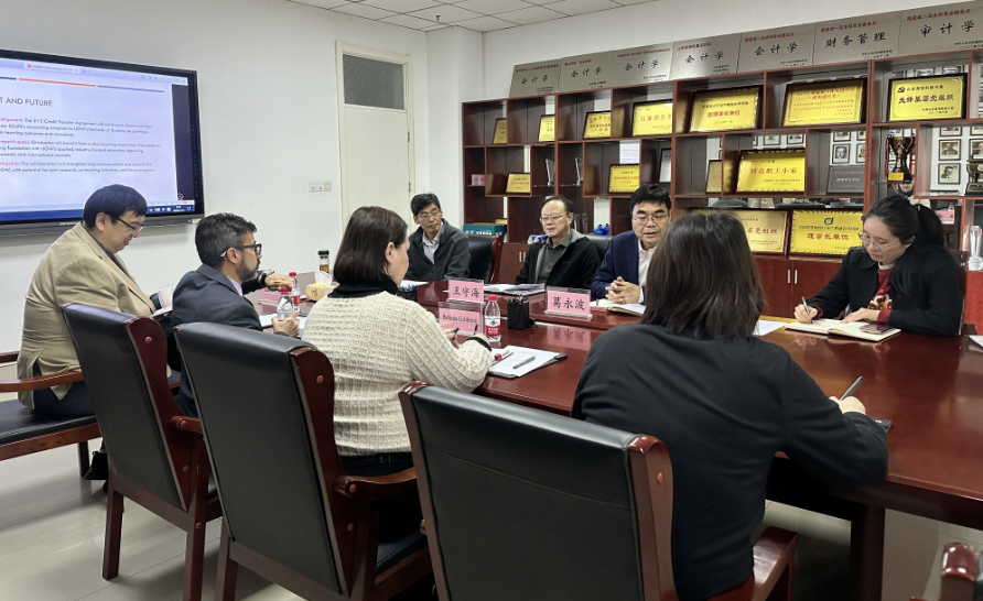 UOW商学院会计系主任Tairan Huang回顾了自2017年双方国际合作项目中的务实合作成果,强调两校在人才培养模式创新、课程衔接和学生支持等方面取得了显著成效。双方围绕师生互访、教师培训、国际认证、联合科研、学生实习与就业支持、以及短期海外学习项目等议题展开了深入讨论,并在未来拓展”2+2”合作办学方向达成深度共识。