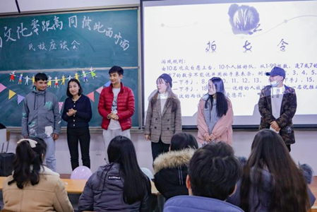 五十六个民族铸就中华民族,五十六种风采共谱中华文化。12月5日晚,由学院民族事务部主办的“与文化零距离,同彼此面对面”民族联谊会在圣井校区6-120教室举行。活动由洪紫薇、李皓玥主持。