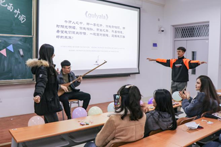 买尔旦为我们带来新疆歌曲《gulyala》,搭配特色的民族乐器,灵动悦耳。在他演唱期间有两位同学即兴加入,随着音乐翩然起跳。有歌有舞,怎一个美字了得。