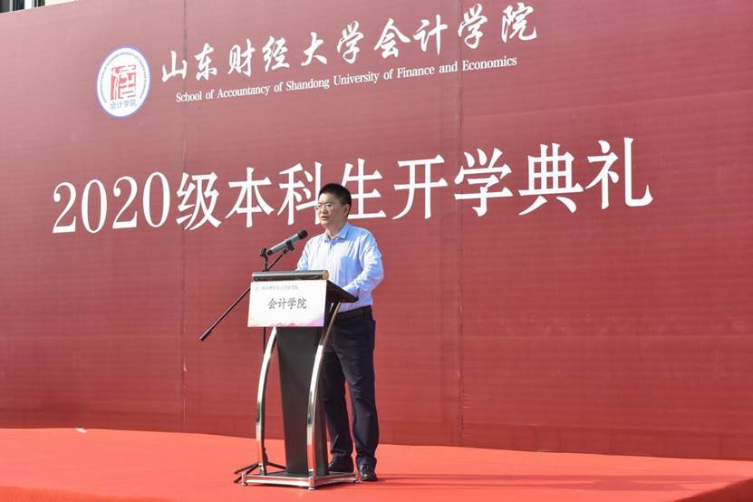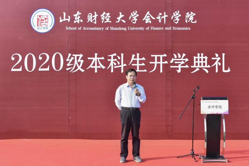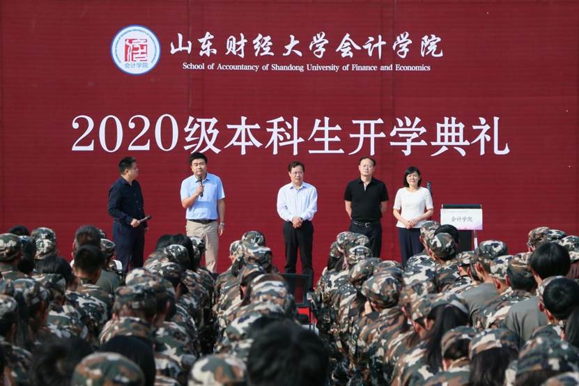 9月27日下午,会计学院2020级本科生开学典礼在圣井校区隆重举行。会计学院院长、党委副书记王爱国,MPAcc中心主任、副院长朱德胜,党委副书记付亚,副院长孙文刚、王守海,财务会计系主任、院长助理韩跃,优秀校友代表、山审集团董事长郭法远,团委书记于苗,就业办主任史岩,学工办主任赵鸿雁,辅导员郭秀娟出席,学院高年级学生代表和2020级全体新生参加。典礼在庄严的国歌声中拉开帷幕。
