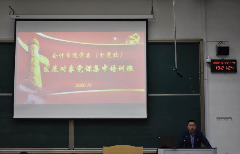 为进一步加强我院发展对象的培养教育,提高其政治素质和理论水平,确保新党员发展的质量,全面落实从严治党要求,严把党员“入口关”,2020年10月29日晚,会计学院党委在逸夫楼Y401组织了第十八期发展对象党课集中培训开班仪式,本次培训邀请学校党委组织部副处级组织员杨立忠讲授,采取线上线下相结合的方式有序进行。开班仪式由学院党委专职组织员郑大伟主持。