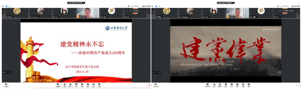 学史明纪,筑梦前行。在研究生第六党支部举办“建党精神永不忘”主题党日活动中,党员们观看《建党伟业》红色电影,重温了中国共产党成立的艰辛历程,深刻理解了革命先辈的崇高理想和坚定信念。红色经典是中华民族宝贵的精神财富,更是激励我们不断前进的强大精神动力,党员们在线互动交流,分享心得与体会,更加坚定了其为实现中华民族伟大复兴的中国梦而努力奋斗的决心和信心。